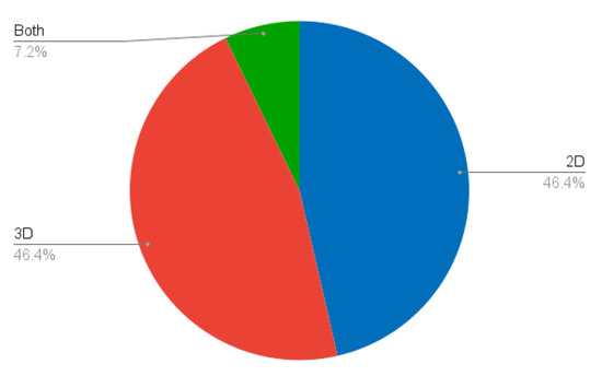 Percentage of studies according to their image dimensionality (2D vs. 3D).