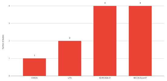 Almotairi et al. (2020) [42] explore the application of the SegNet architecture. The proposed modified SegNet model uses the VGG-16 network as an encoder. Tests were performed on a standard dataset for liver CT scans (3D-IRCADb01 [43]), achieving a tumour accuracy of up to 99.9% in the training phase and 86% for tumour identification.