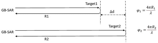 Figure 1 depicts the schematic diagram of GB-SAR differential interference deformation monitoring. Target 1 denotes the initial position of the target, whereas Target 2 corresponds to its position after displacement. The radar performs measurements on these targets both before and after deformation, capturing their respective phase information. Subsequently, the phase difference between the two is determined:
