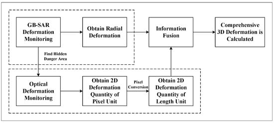 Since optical deformation monitoring can provide information within the plane perpendicular to the line of sight, we aim to utilize optical images to supplement the three-dimensional deformation information that cannot be obtained through radar monitoring. The workflow of the proposed method is shown in Figure 2. The main steps include radial deformation monitoring based on GB-SAR, optical deformation monitoring, pixel deformation conversion to deformation under the basic length unit, data information fusion, and three-dimensional deformation calculation.