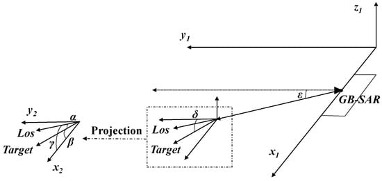 where , , and are the monitoring results for the X-axis, Z-axis, and radar radial direction, respectively, and is the real deformation of the target. Finally, the radial deformation measured by GB-SAR and the plane deformation measured by the optical camera are substituted into the model to obtain the complete deformation, .
