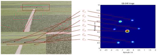 The GB-SAR image and an optical image of these corner reflectors are depicted in Figure 11, where represents the corresponding position of the nth corner reflector in the optical and radar image.