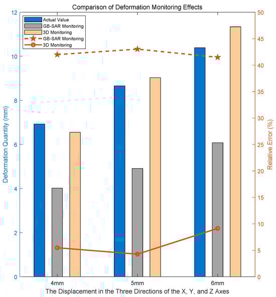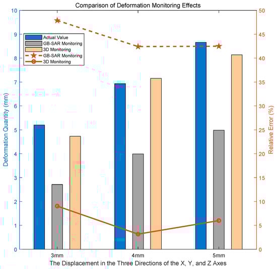 In order to better show the effect of the experiment, the target was moved the same distance along the X-axis, Y-axis, and Z-axis by 3 mm, 4 mm, and 5 mm, respectively. The comparative experimental results are illustrated in Figure 17. The term “GB-SAR Monitoring” denotes the outcomes obtained through the exclusive use of GB-SAR for deformation monitoring, and “3D Monitoring” signifies the results obtained by applying the method proposed in this paper to deformation monitoring.