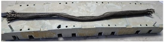 To commence the manufacturing process of a handlebar, the carbon-fiber braiding had to first be cut, utilizing the mold as a reference, as shown in Figure 3. Subsequently, all layers had to be carefully unrolled to facilitate the placement of the internal bag for positive pressure compaction. These preforms, shaped according to the design specifications, served as the foundational elements for the handlebar’s structure.