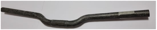 Upon completion of the wetting process for all layers, the mold is closed, and the bag is inflated to a pressure of up to 2 bars. Maintaining optimal pressure is crucial to achieving the desired fiber percentage and compaction, as well as ensuring the correct shaping of the mold’s curves. The pressure bag primarily consists of 80% Rubber-Isobutylene-isoprene rubber (IIR)-Butyl, supplemented with either 20% or 10% IIR. Typically, there is no necessity to utilize wax or any demolding agent, as the internal bag can be easily removed thereafter. This step ensured that the composite materials conformed precisely to the mold’s shape, eliminating voids and enhancing the structural integrity of the handlebar. The final braided-carbon handlebar can be observed in Figure 4.