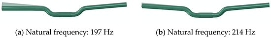 Consistent with the conditions applied in the static calculations, the same boundary conditions were adopted for the natural frequency analysis. The central part of the handlebars was set over a width of 20 mm, ensuring alignment with real-world scenarios and facilitating a meaningful comparison of results.