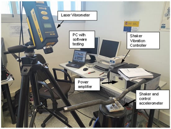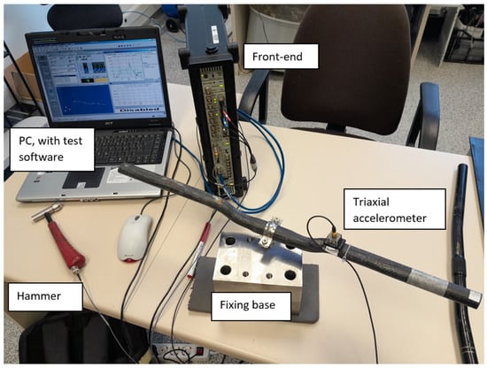 The first mode and natural frequency of the two configurations analyzed were experimentally determined. For this purpose, an Experimental Modal Analysis (EMA) was conducted using an impact hammer to excite the structure and a low-mass triaxial accelerometer to measure the response. The handlebar was rigidly fixed in the central part to replicate the boundary conditions of the numerical modal analysis. Figure 7 illustrates the equipment used and the test configuration.