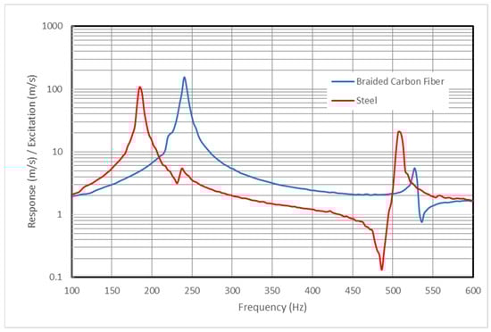 The transfer functions obtained for the two handlebars under testing, one constructed from steel and the other from Braided Carbon Fiber–Epoxy Resin Composite, are visualized in Figure 8.