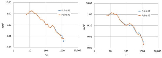 For this evaluation, the total vibration value of frequency-weighted Root Mean Square (R.M.S.) acceleration was determined for both the steel and carbon-fiber handlebars. Acceleration spectra were recorded at points #1 and #2, corresponding to the ends of the handlebars where the cyclist’s hands rest. Vibration signals were captured along the three Cartesian axes: X, Y and Z. Refer to Figure 9 for visual representations of the acceleration spectra.