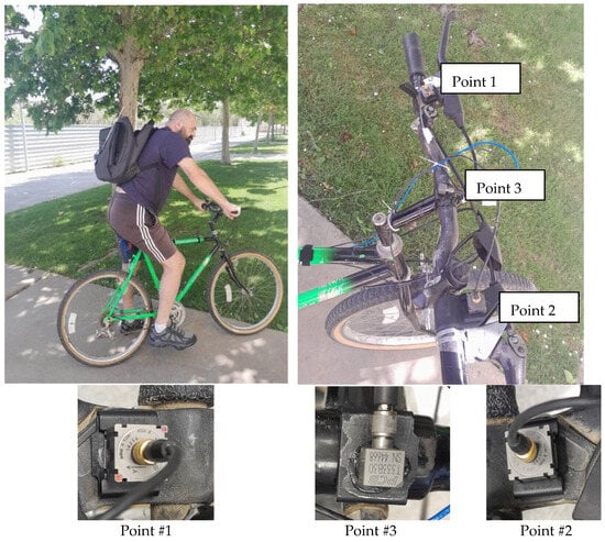 Various sensors can be employed to experimentally measure the response of the bicycle and the cyclist to evaluate vibrational comfort. Vanwalleghem, J. et al. [4,5] conducted tests by instrumenting the bicycle with accelerometers, custom-made contact force sensors and velocity sensors. They asserted that their sensor design approach, particularly for outdoor testing with racing bicycles, could offer a novel interpretation in evaluating cyclist comfort. This approach quantifies vibrational load not only in terms of acceleration but also in terms of force and velocity at the bicycle–cyclist contact points. Additionally, they used a strain-gauge-based handlebar force sensor that was implemented for static and dynamic load measurements. In this article, we first obtained the transmissibility function numerically, representing the relationship between excitation introduced to both handlebars through their stem and the response in the handle area. Subsequently, an experimental analysis was conducted wherein a random vibrating signal of constant amplitude (0.01 g2/Hz) was applied using a shaker in a frequency range between 100 Hz and 1200 Hz, and the response was measured at one of the two cantilevered ends of the handlebar. A laser vibrometer and control accelerometer in the shaker were applied. The transmissibility, natural frequencies and damping functions were obtained. Subsequently, another experimental analysis was carried out with the instrumented handlebars mounted on a bicycle, placing three accelerometers and a GPS meter and traveling through a real test circuit.