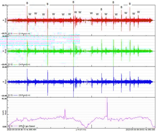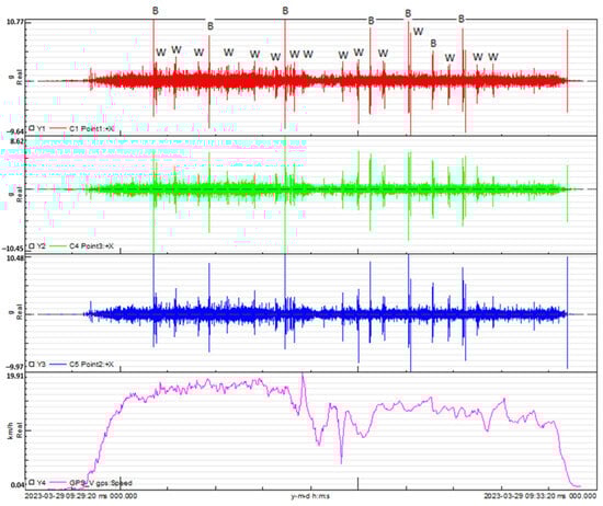 The same comprehensive analysis was applied to the handlebar made of the braided-carbon-fiber composite. In Figure 20, the cycles between extreme speed values are presented for this handlebar at the three measurement points where accelerometers were applied. Figure 21 complements this by showcasing the histogram, illustrating the distribution of vibration cycles at each of the three acceleration measurement points on the handlebar.