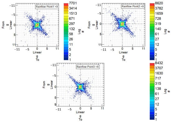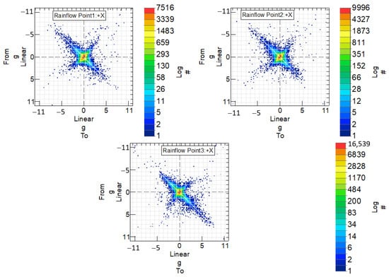 Figure 17 illustrates the number of cycles measured between extreme acceleration values for the steel handlebar at the three designated measurement points where accelerometers were applied. The legend “from” and “to” in the graph represent the initial and final values, respectively, defining the vibration cycle. The color scale indicates the frequency of occurrence of these vibration cycles, with each color representing a different number of cycles. To enhance clarity, the values on the color scale are represented on a logarithmic scale denoted by the legend “log”.