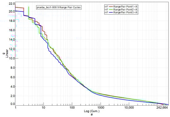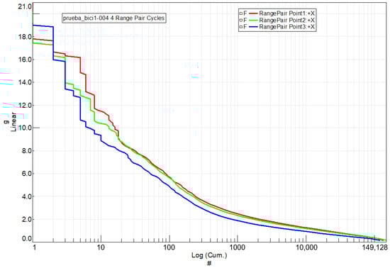 Figure 18 presents the histogram that tallies the cycles represented in Figure 17 for the steel handlebar at each of the three acceleration measurement points. A total of 149,128 cycles were counted. The histogram illustrates the distribution of cycles across various ranges of acceleration variation.