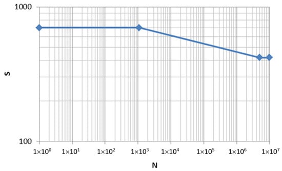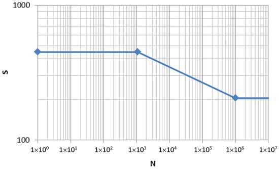 The S-N curve used for the braided carbon and epoxy resin composite, shown in Figure 22, was obtained from the research carried out by Carvelli, V. et al. [18], taking into account that tensile strength in the longitudinal direction (X) equals 700 MPa and fatigue strength can be calculated as a 60% of X (420 MPa).