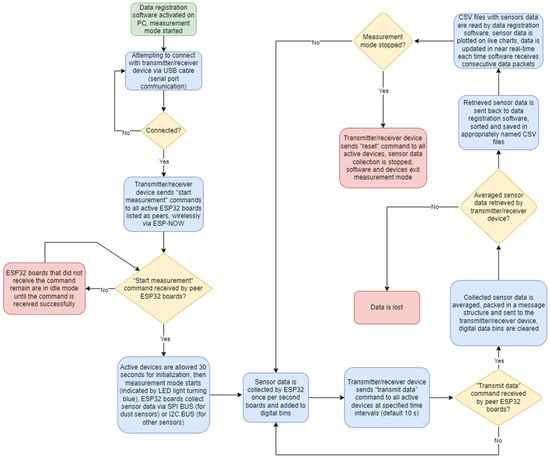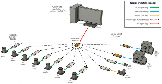 Each sensor is operated with an ESP32 microcontroller as well as the base transmitter–receiver unit connected to a computer. Communication between the sensors and transmitter–receiver unit is performed using the ESP-NOW communication protocol. The transmitter–receiver unit is connected to the computer using a standard USB connection and data transfer protocol. The electronics of all sensors and transmitter–receiver devices are housed in protective cases modelled using CAD software Autodesk Fusion 360 (v.2.0.16985) and were 3D-printed with fused deposition modelling (FDM) technology using PLA filaments. Figure 2 presents a step-by-step explanation of how the measuring system works.