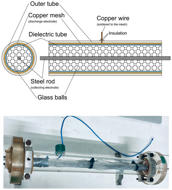 To test our system, we chose cigarette smoke as a source of pollution. To reduce cigarette smoke, a DBD (dielectric barrier discharge) plasma reactor in its classical tubular geometry was designed, created, and tested during experiments. The reactor was based on a cylindrical dielectric tube made of PMMA with a diameter equal to 20 mm equipped with two electrodes (Figure 3). The outer electrode was made of copper wire mesh, and the inner one was made of a steel rod with a diameter equal to 5 mm. Between the electrodes, glass balls with a diameter of 3 mm were placed. This kind of plasma reactor was widely used in previous years [16].