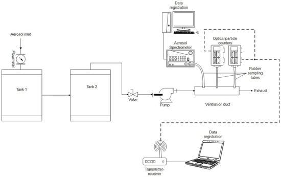 The meters were validated by comparing the measurements of the mass concentrations of suspended dust fractions obtained using the constructed meters (A and B) with the measurements obtained using the reference meter. Despite the ability of the built meters and the reference meter to measure the particle size distribution, no comparison was made in this respect due to differences in the measuring ranges of the meters (the built meters measured particles in the aerodynamic diameter range from 0.3 to 40.0 μm between 24 sorting channels, and the reference meter measured in the range 0.25–32.0 μm between 31 channels). Air polluted with smoke from burning matches was used as the research medium. This research was conducted using the research system shown in Figure 4. The airflow rate in the system during the test was approximately 5.5 L/min.