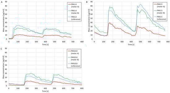 Based on the curves in the graphs in Figure 5, suitable agreement in the measurement trends was found between the constructed particulate matter meters and the reference meter. Based on the data in Table 2, poor agreement was seen regarding the measured average mass concentrations of PM1.0, PM2.5, and PM10.0 between the constructed meter A and the reference meter (the average percentage errors of all three measurement series were above 50%). In the case of meter B, high compliance was found with the average PM1.0 and PM2.5 concentration values obtained using the reference meter. The agreement between the PM10.0 concentration measurements using meter B and the reference meter was higher than that using meter A, but the percentage error was still high (−33.14%).