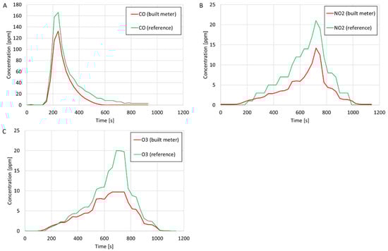 Figure 7. Validation of gas meters: (A) CO concentration (first series of measurements); (B) NO2 concentration (second series of measurements); and (C) O3 concentration (second series of measurements).