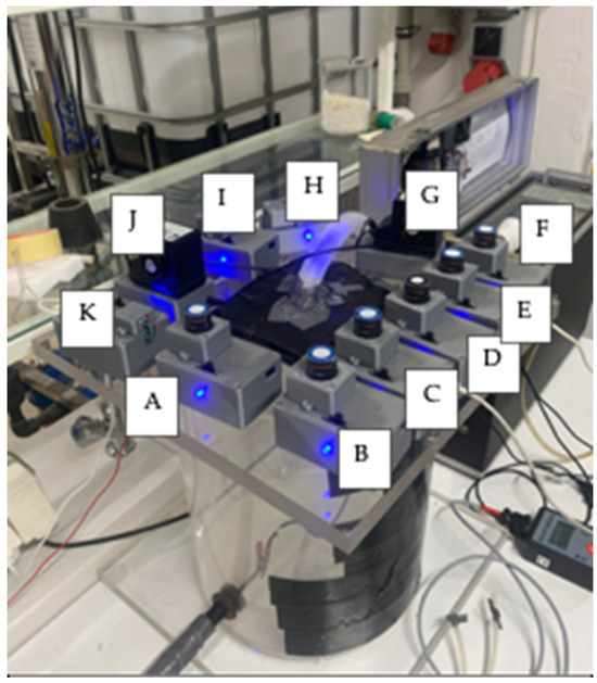 Figure 8. Measuring system to measure the quality of ambient air in the laboratory. A—CO senor, B—O3 sensor, C—H2S sensor, D—NH3 sensor, E—NO2 sensor, F—O2 sensor, G, J—AlphaSens particulate matter sensors, H—SO2 sensor, I—VOC sensor, and K—CO2 sensor.
