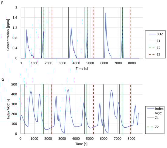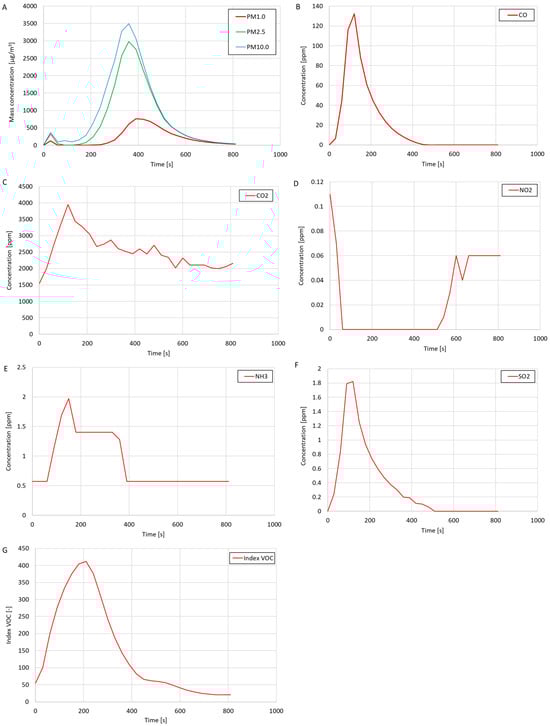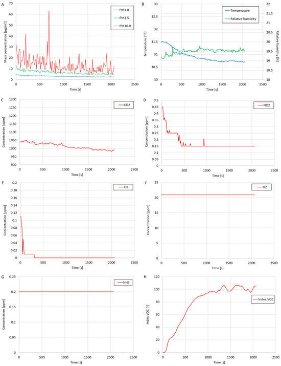 Figure 10. The results of testing the quality of air polluted by cigarette smoke: (A) mass concentration of suspended dust (dust meter B); (B) CO concentration; (C) CO2 concentration; (D) NO2 concentration; (E) NH3 concentration; (F) SO2 concentration; and (G) VOC index.
