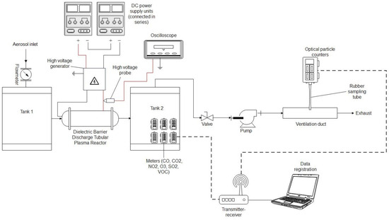 The experimental set-up presented in Figure 3 was used for air purification from cigarette smoke pollution. The smoke from cigarettes was sucked into tank 1 and introduced into the plasma reactor. After passing through the reactor, the air was sucked into tank 2, where gas sensors were placed. The flow through the system was established using an air pump (SC101MG0.2M, Emmecom, Singapore, Malaysia)) equipped with a valve that allowed the assumed airflow through the system. The airflow was measured using a flow meter (model 4001, TSI, Shoreview, MN, USA). The airflow through reactors during the experiments was established at 10 L/min. An aerosol spectrometer (model 1.109, GRIMM, Hamburg, Germany) was used to validate the results obtained from the aerosol particle meter sensors. A gas analyser (model GA-60, MADUR, Zgierz, Poland) was used to validate the NOx and CO concentrations in the air. To validate the O3 concentration measurements, an ozone meter (model OCT-3, DeltaTech Electronics, Jasło, Poland) was used.