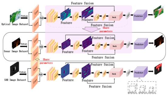 16] proposed a multi-domain collaborative migration learning for side-scan sonar images of sunken ships and wrecked aircraft in response to the shortcomings of semi-synthetic data and the inability of pre-trained models based on large optical datasets to match sonar image feature classification, which mainly considers convolutional layers near the input layer to improve the ability to extract low-level edge features from the noisy background of targets in sonar images, which usually have noise-statistical features similar to synthetic aperture radar (SAR) images. Several fully connected layers near the output layer enhance the ability to map high-level feature vectors to the semantic space of sample classes, and optical images with a similar shape as the same target class as sonar features. Chen et al. [