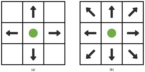 In the environmental map, the choice of search neighborhood is crucial when the A-star algorithm traverses the nodes from the start point [,]. Search neighborhood selection is the process of selecting a goal node within a specified area around the current node. Common search neighborhood selection methods include 4-neighborhood search and 8-neighborhood search, as shown in Figure 2.