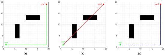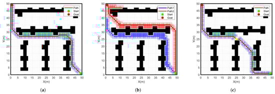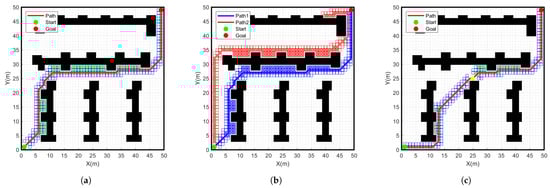 Simulation results of different algorithms for start point (1, 1) goal point (49, 49) on a 50 × 50 grid map. (a) Traditional A-star algorithm, (b) Bidirectional A-star algorithm, (c) Improved A-star algorithm.