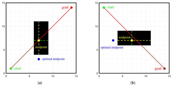 When the calculated midpoint is inside an obstacle, it prevents an effective search from the midpoint to the start and goal points. Thus, we need to select the new midpoint, as shown in Figure 5. The specific steps are as follows: