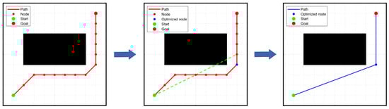 - If the connecting line segment does not intersect any obstacles until it reaches the goal point, the goal point is retained and all nodes between the start node and the goal point are removed.