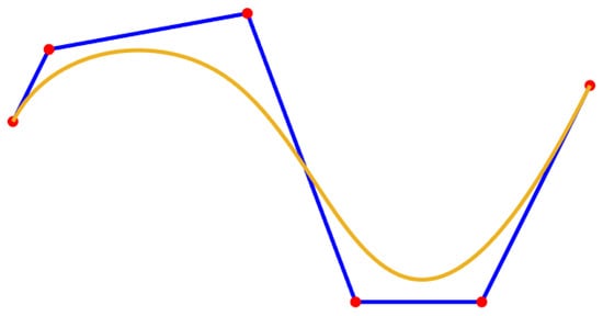 Commonly used smoothing path methods include B spline curves [] and Bezier curves. The B-spline curve is a general form of the Bezier curve, as shown in Figure 7. The order and the number of control points of the B-spline curve can be varied independently, which has good local control and path smoothing effect []. Therefore, this paper selects the B-spline curve to smooth the path after removing redundant nodes.