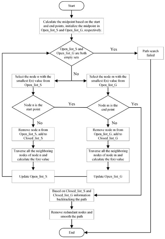 Based on the traditional A-star algorithm, we introduce a bidirectional search strategy, improve the heuristic function, remove the redundant nodes, and smooth the generated paths by using a cubic uniform B-spline curve, and the specific steps are shown in Figure 8.