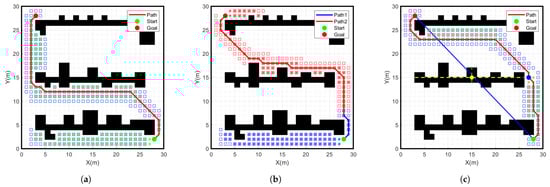 Simulation results of different algorithms for start point (3, 1) goal point (28, 29) on a 30 × 30 grid map. (a) Traditional A-star algorithm, (b) Bidirectional A-star algorithm, (c) Improved A-star algorithm.