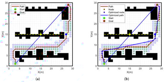 Simulation experiment results of improved A-star algorithm. (a) Improved A-star algorithm, (b) Remove redundant nodes.