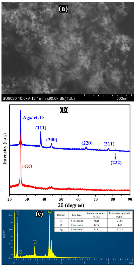 SEM image (a), XRD pattern (b), and EDX spectrum (c) of Ag@rGO.