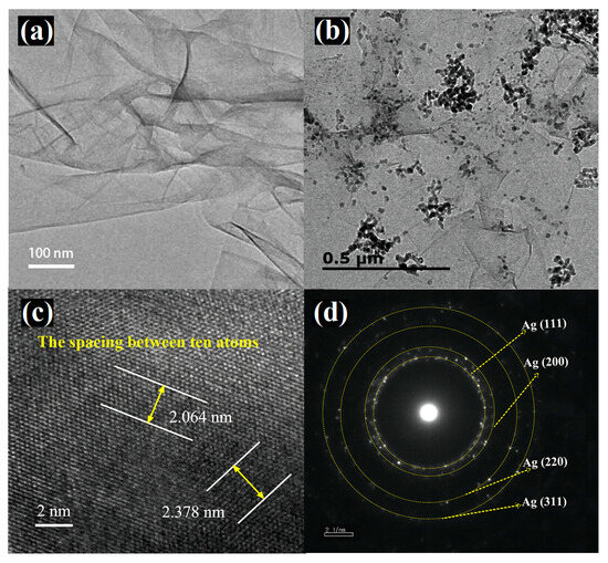 Figure 2a depicts the TEM micrograph of rGO, with obvious wrinkles on its surface but no other substances adhering to it. Figure 2b shows the TEM image of Ag@rGO nanocomposite, and it is evident that spherical silver nanoparticles were dispersed on rGO sheets, with a size range of 10–40 nm. Parts of the silver nanoparticles are stacked together, consistent with the SEM results. The high-resolution TEM (HRTEM) images of Ag@rGO in Figure 2c clearly demonstrate the presence of Ag in the (111) (d111 = 0.2378 nm) and (200) plane (d200 = 0.2064 nm), respectively. The selected area electron diffraction (SAED) pattern is shown in Figure 2d, which is composed of four concentric rings with different radii. The formation of this circular pattern may be due to the presence of a large number of disorderly oriented particles. Small crystal particles in the sample area under electron beam irradiation indicate that the silver nanoparticles belong to a polycrystalline structure [45].