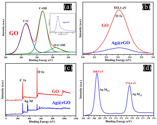 The chemical states of Ag and carbon in Ag@rGO were determined under XPS. Figure 3a shows the high-resolution C1s spectrum of GO, with three peaks located at 284.6 eV (C=C), 286.7 eV (C-OH), and 288.4 eV (O=C-OH), denoting the presence of different functional groups (double bonds, hydroxyl groups, and carbonyl groups) on the GO sheet [46]. Based on the blue curve (Ag@rGO) in the insert image in Figure 3a, it can clearly be seen that the intensity of the C=C peak does not change significantly, while the peaks of C-OH and O=C-OH almost disappear. As displayed in Figure 3b, compared to the O1s of GO, the peak value of O1s (Ag@rGO) significantly decreased, indicating that the vast majority of oxygen-containing functional groups in GO were reduced. Figure 3c shows the peaks related to C1s, Ag 3d, and O1s in the Ag@rGO nanocomposite. Compared to the XPS spectrum of GO, the C1s and Ag 3d peaks dominate in Ag@rGO, and the peak intensity of O1s is greatly reduced. Figure 3d shows the high-resolution XPS of the 3d peak of Ag. The peaks mainly occur at 368.5 eV (3d5/2) and 374.6 eV (3d3/2), with spin energy separation values of approximately 6 eV between the two peaks confirming that silver is in a zero-valence state on the surface of rGO sheets [47].