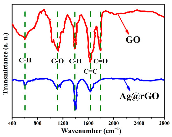Figure 4 shows the FTIR spectra of GO and Ag@rGO. It is evident that after the reduction reaction, the characteristic peaks of C-O (1121 cm−1) and C=O (1796 cm−1) in GO almost disappear in the FTIR of Ag@rGO. All results show that GO and AgNO3 were successfully reduced in one step at room temperature to the Ag@rGO nanocomposite.