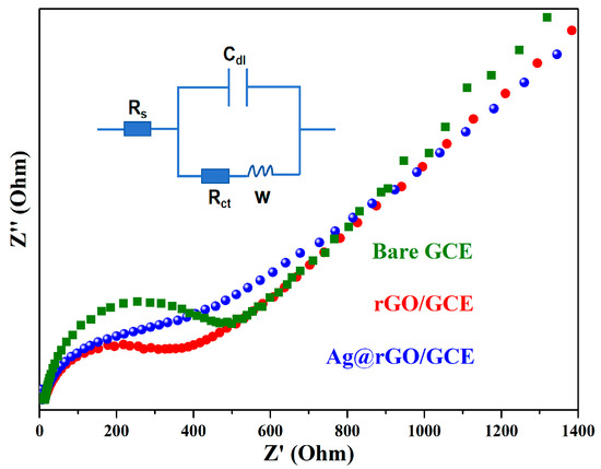 Fit the obtained impedance data using a Randles circuit (illustrated in Figure 5), including the electron transfer process (charge transfer resistance Rct) and diffusion process (Warburg-type impedance) [49]. The electron transfer resistance (Rct) is estimated to be 495 Ω, 378 Ω, and 206 Ω, corresponding to GCE, rGO/GCE, and Ag@rGO/GCE, respectively. The results indicate that Ag@rGO/GCE possesses good interfacial electron transfer performance, which is beneficial for constructing highly sensitive electrochemical sensors.