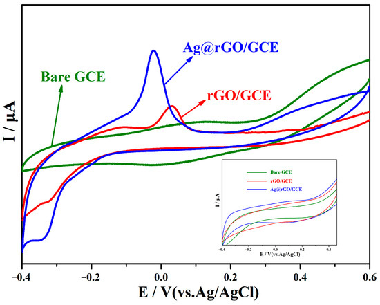 The electrochemical detection performance of L-cysteine in phosphate-buffered solution (pH = 7.0) was emulated via cyclic voltammetry (CV) using GCE, rGO/GCE, and Ag@rGO/GCE. Figure 6 displays the cyclic voltammetry of different electrodes in response to L-cysteine (50 μM). Obviously, GCE has no electrocatalytic activity toward L-cysteine, since no significant redox peak is observed. In the potential range of −0.40–0.60V, a strong oxidation peak appears at +0.0316 V, and a very weak reduction peak appears at −0.3247 V on the CV diagram of rGO/GCE, indicating that the redox process of L-cysteine on the electrode is almost irreversible. In the CV pattern of Ag@rGO/GCE, a strong oxidation peak appears at −0.0208 V; a weak reduction peak appears at −0.3452 V; and the oxidation overpotential decreases. Usually, the electrochemical determination of L-cysteine requires a high oxidation overpotential. For example, Wang et al. [50] reported that when using Pt/Fe3O4 nanoparticles/reduced-graphene-oxide-modified GCE to detect L-cysteine, an irreversible CV peak at +0.65V was observed. Cao et al. [51] reported that an electrochemical oxidation potential of +0.522V was observed on an electrode modified with gold nanoparticles. The above experimental results indicate that Ag@rGO/GCE-modified GCE has excellent electrocatalytic performance for L-cysteine. As shown in the inserted figure, none of the three electrodes showed significant redox peaks for the phosphate-buffered solution (pH = 7.0) without L-cysteine sample.