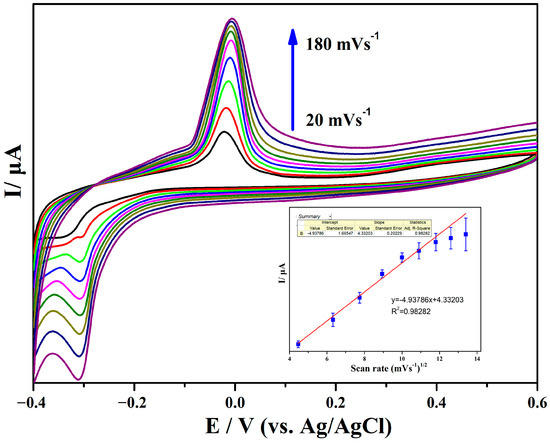 Effect of scanning rate on the voltammograms of Ag@rGO/GCE in pH = 7.0 phosphate-buffered solution at 20, 40, 60, 80, 100, 120, 140, 160, and 180 mV s−1. Inset: Plot of the peak currents (I) vs. square root of the scanning rate.