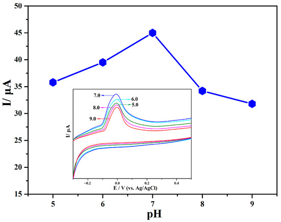 In order to optimize the experimental conditions for L-cysteine detection, the effect of Ag@rGO/GCE on the electrochemical behavior of L-cysteine at pH values from 5.0 to 9.0 was investigated using the CV method. As shown in Figure 8, the oxidation peak current increased with the increase in pH (5.0–7.0); meanwhile, when the pH value exceeded 7.0, the peak current value decreased. This indicates that under the condition of pH = 7.0, Ag@rGO/GCE exhibits the best electrocatalytic performance for the oxidation of L-cysteine. Therefore, in order to obtain the optimal current response conditions, experiments exploring the electrochemical behavior of Ag@rGO/GCE for L-cysteine were conducted in a phosphate-buffered solution with pH = 7.0.