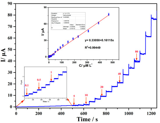 Under steady-state conditions, the current method is a simple and sensitive electrochemical detection method [4]. In an optimized state, applying a potential of −0.0208 V and continuous stirring to promote solution homogenization, the typical amperometric response signals obtained by continuously adding different concentrations of L-cysteine are shown in Figure 9. At the initial stage, low concentrations of L-cysteine were added, and a steady-state current response was obtained within 2–5 s, implying a fast electron transfer process in the electrode. Subsequently, in the following steps, samples of the same concentration were added three times every 50 s, with concentrations of 0.1, 0.5, 1, 5, 10, 20, 40, and 80 μM, respectively. L-cysteine exhibits a significant linear increase in current response. The sensor possesses a wide linear range from 0.1 μM to 470 μM (S/N = 3), and the linear regression equation is as follows: iPa (μA) = 0.33058 + 0.16115 CL-cysteine (μM). As shown in the inserted figure, the R is equal to 0.99449; sensitivity is 215.36 nA M−1 cm−2; and the detection limit (LOD) is 0.057 μM. Table 1 lists the detection parameters of some other electrochemical sensors for L-cysteine. Compared to them, the detection range and limit of Ag@rGO/GCE for L-cysteine were significantly improved. The results indicate that the Ag@rGO nanocomposite can be used as an excellent electrode material for detecting L-cysteine, which can be attributed to the large surface area, rich active sites, high conductivity of silver, and excellent catalytic activity of rGO. In addition, in a 40 mL phosphate-buffered solution (pH = 7.0), the Zeta potential of Ag GO nanocomposite was measured to be −16.5 mV, indicating that Ag-supported graphene nanomaterials have excellent stability [53], promoting the collision and binding of L-cysteine with quantum dots on the material [38] and undergoing rapid oxidation reactions under the catalysis of Ag nanoparticles.
