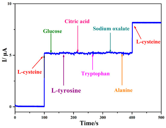 To demonstrate the selectivity of the Ag@rGO/GCE sensor, the potential interferences of some typical organic compounds for the detection of L-cysteine were also investigated using the amperometric method. As can be seen in Figure 10, when 50 μM L-cysteine was added to the test sample, there was a significant change in the current response. When 200 μM interferents—such as glucose, L-tyrosine, citric acid, tryptophan, sodium oxalate, and alanine—were added, the current response value hardly changed. This indicates that Ag@rGO/GCE has good anti-interference ability in detecting L-cysteine.