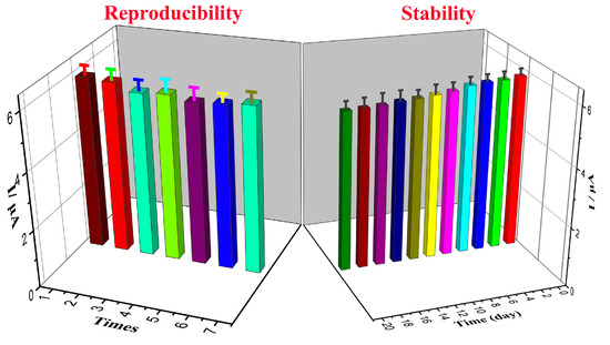 Reproducibility and stability of Ag@rGO/GCE for L-cysteine determination; the error bars illustrate the standard deviations of three independent measurements.