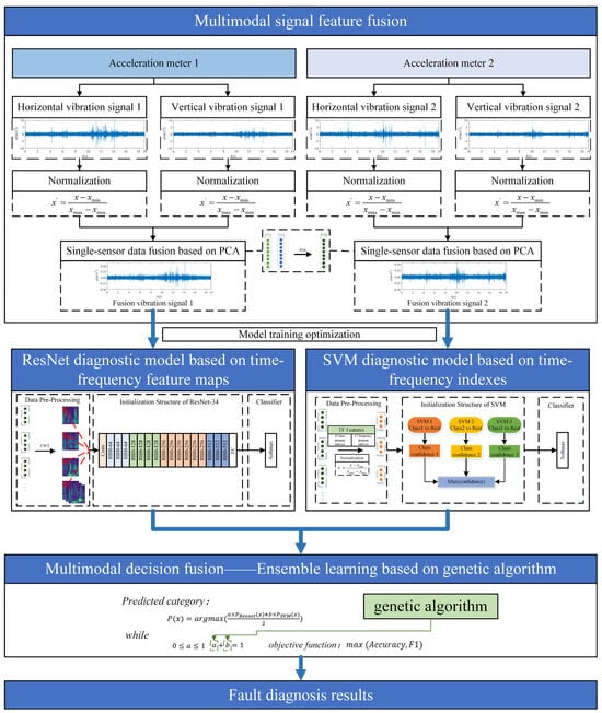 Initially, HVS and VVS from the bearing are captured by two sensors and normalized via min-max scaling. Subsequently, the vibration signals in both directions undergo fusion using min-max scaling and PCA. In the next stage, the fused feature signals (FVS) from the two sensors are partitioned into datasets. Time-frequency maps are generated using CWT, while a ResNet model is trained to establish a diagnostic model. Simultaneously, 28 time-frequency feature index parameters are extracted, normalized using min-max scaling, and used to train SVM for another diagnostic model. Finally, leveraging the base models obtained, GA optimizes the weight hyperparameters. The final diagnostic model is constructed using ensemble learning techniques, thereby enhancing the overall accuracy of the diagnostic system.