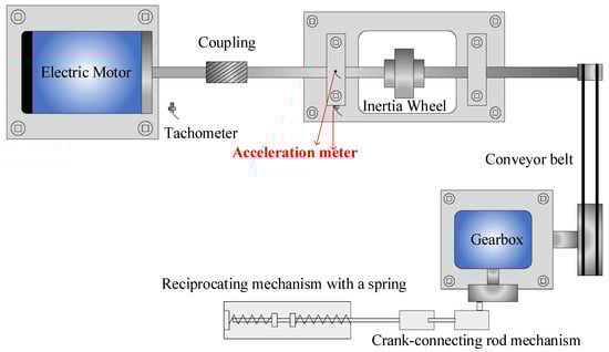 Figure 7. The components of the test rig include an electric motor, an inertia wheel for applying radial load, a coupling, a conveyor belt drive mechanism, a conveyor belt, a crank-connecting rod mechanism, a gearbox, and a reciprocating mechanism with a spring. The bearing under investigation is mounted close to the motor side and is identified as a contact deep groove ball bearing (MB ER-10K). Three distinct types of faults, namely inner race fault (IF), outer race fault (OF), and rolling element fault (RF), were intentionally implanted in the bearing.