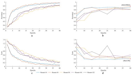 Figure 10b,d, the ResNet-34 model achieves an accuracy of 89.06% with a corresponding loss of 0.396 after 40 epochs of training, indicating superior performance compared to alternative models.