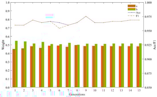 Figure 15, the accuracy and F1 of the model reached their maximum value when the population was iterated to the ninth generation and